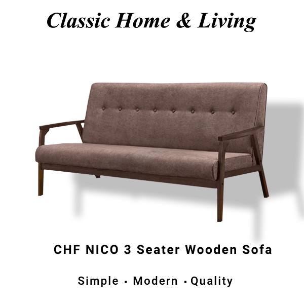 Chf Nico 3 Seater Wooden Sofa Solid Wood Frame Thick And Comfortable Fabric Brown Shopee Malaysia