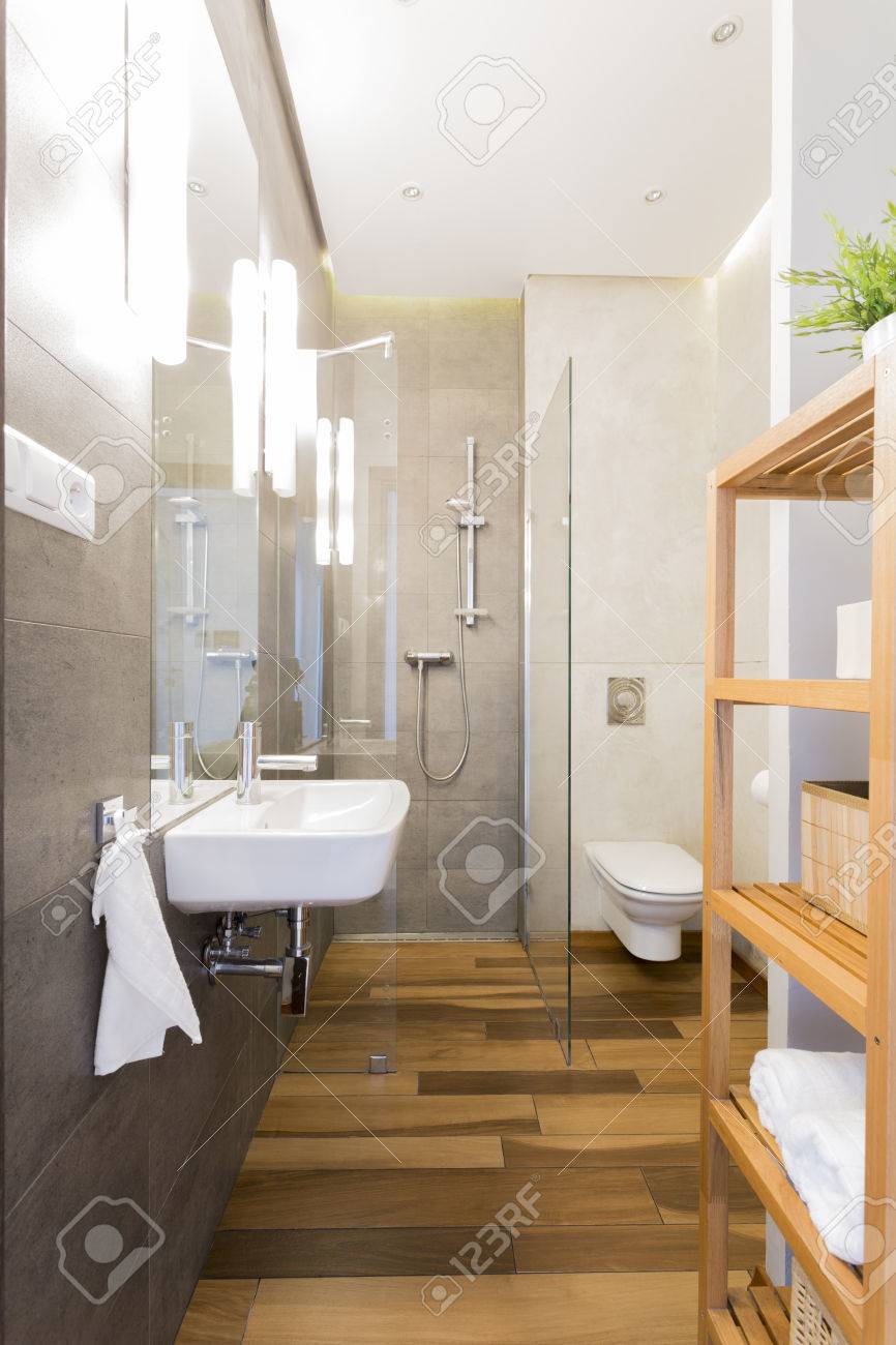 Interior Moderno Del Cuarto De Bano Diseno De Madera Moderno Foto De Archivo Imagen De Maneta Limpio 81284628