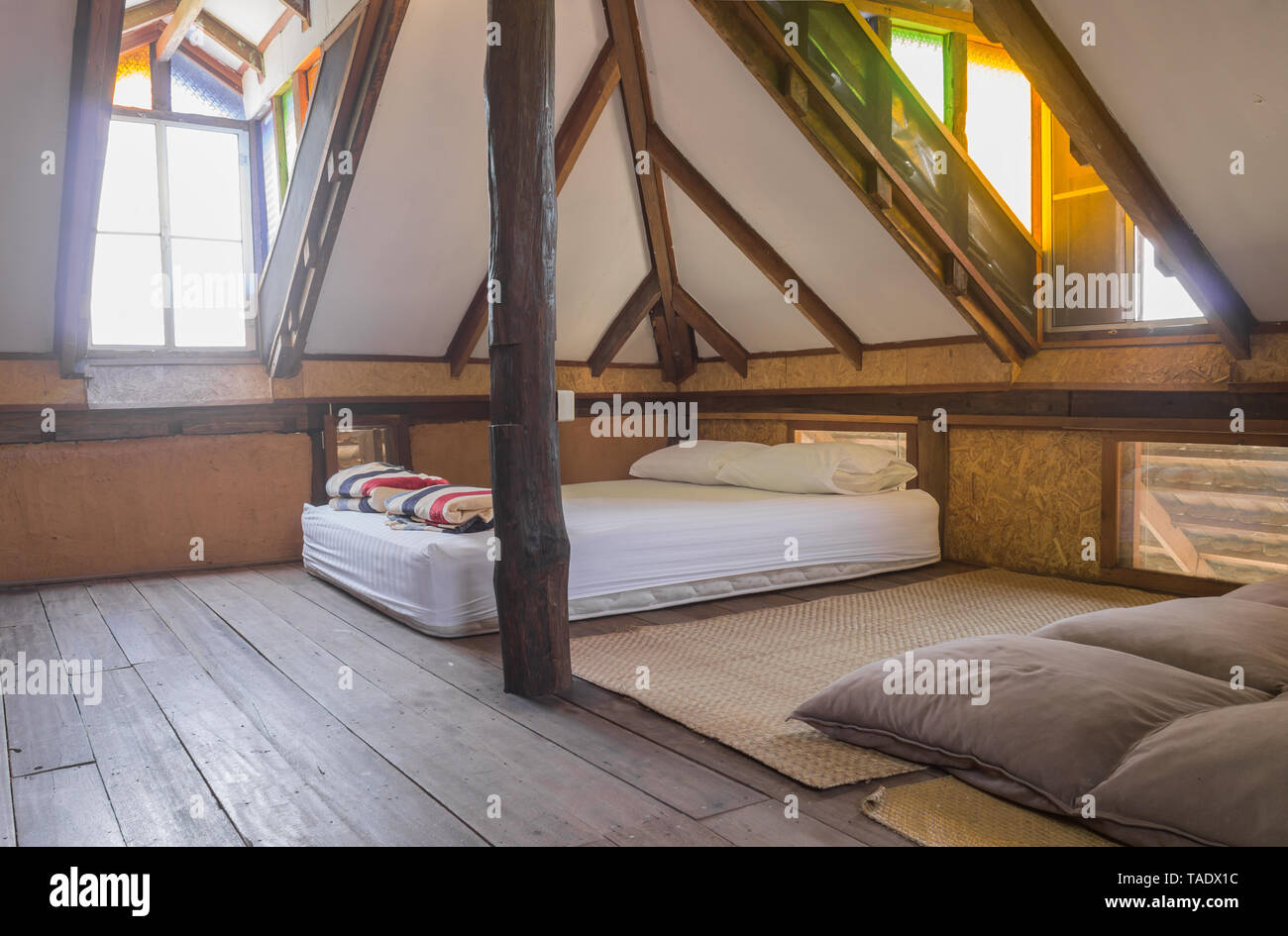 Blanco Y Marron Cama Matrimonial En El Dormitorio Del Pais Loft Habitacion De Diseno Interior Diseno Interior Habitacion Incluyen Fregadero Y Grifo Y Espejo Y Estantes De Madera Y Una Lampara Fotografia