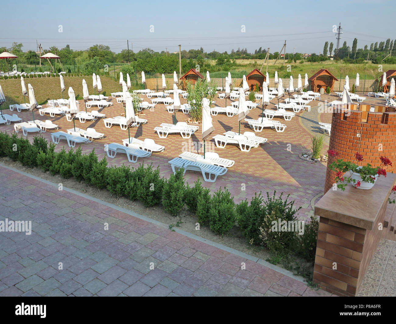 Zona De Playa Blanca Con Tumbonas Sombrillas Y Gazebos De Madera En Los Rayos Del Intenso Sol Del Verano Para Su Diseno Fotografia De Stock Alamy