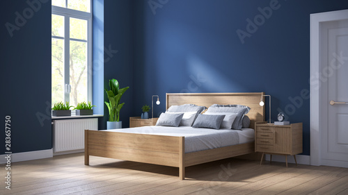 Modern Scandinavian Interior Of Bedroom Wood Bed And Bedside Table On Dark Blue Wall And Wood Floor 3d Render Buy This Stock Illustration And Explore Similar Illustrations At Adobe Stock