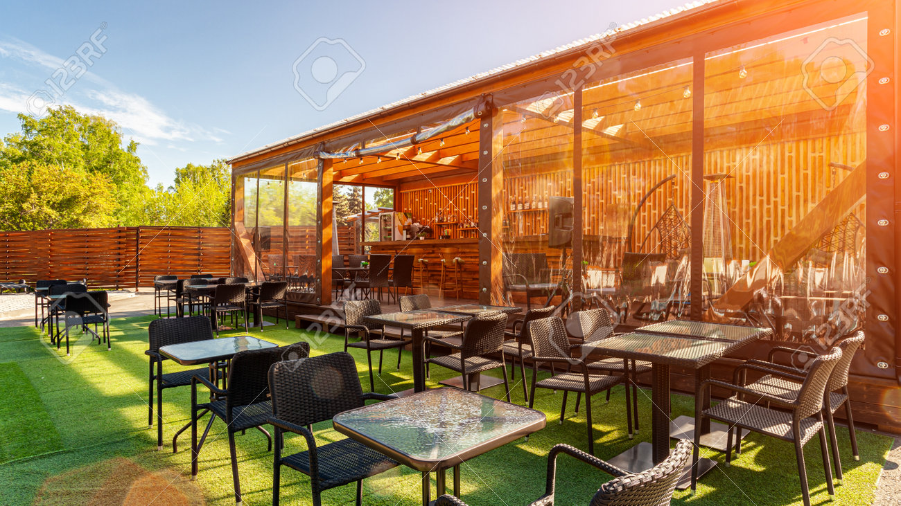 Summer Empty Outdoor Cafe At Park Bar With Modern Design Wooden Stock Photo Picture And Royalty Free Image Image 125438206