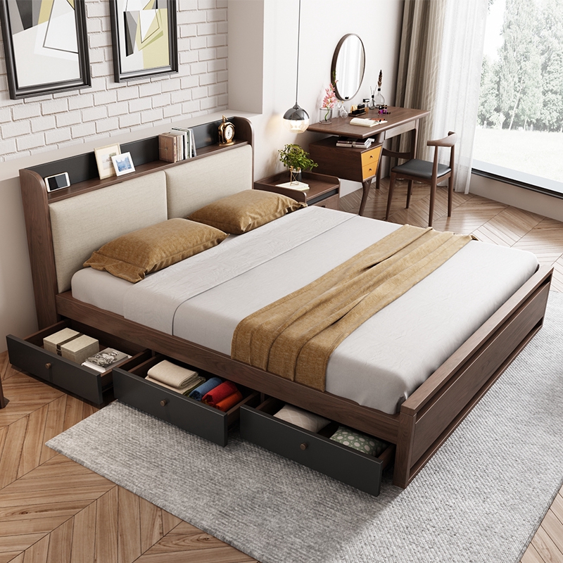 China Nordic Solid Oak Wood Walnut Bed High Box Storage Solid Wood Bed China Double Bed Bedroom Bed