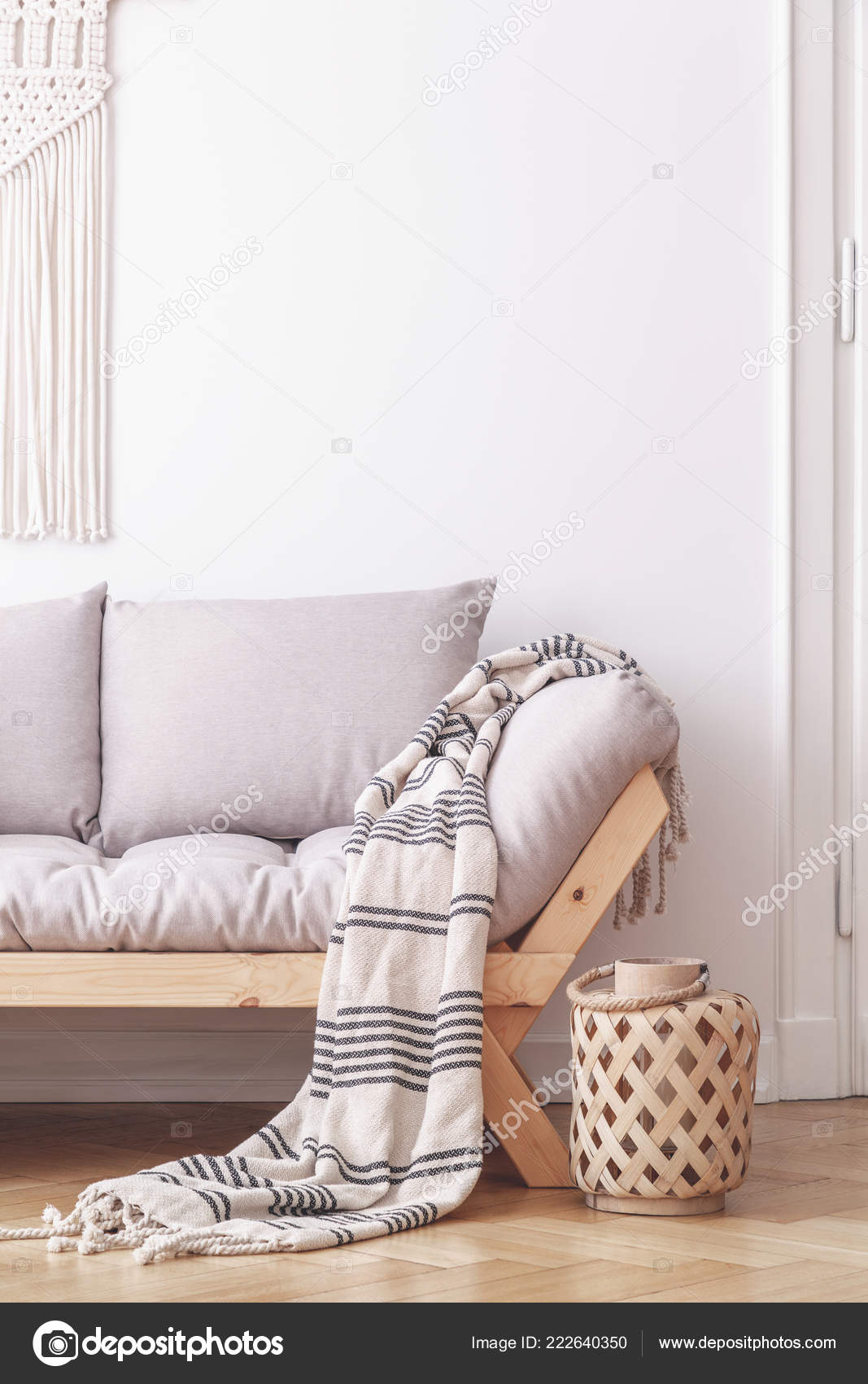 Plywood Lantern Next Wooden Sofa Gray Cushions Blanket Simple Living Stock Photo C Photographee Eu 222640350