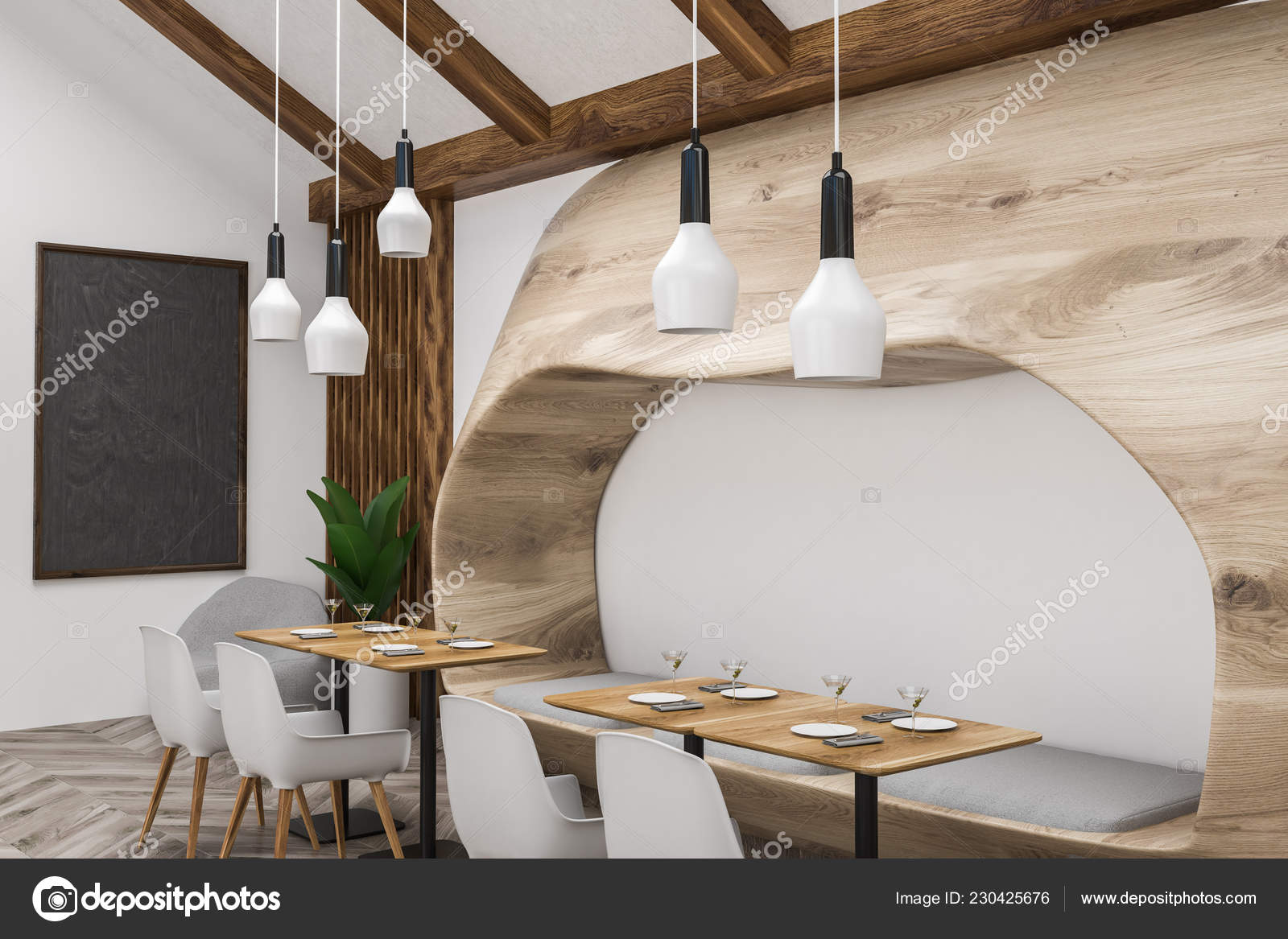 Corner Stylish Restaurant White Walls Wooden Floor Square Wooden Tables Stock Photo C Denisismagilov 230425676